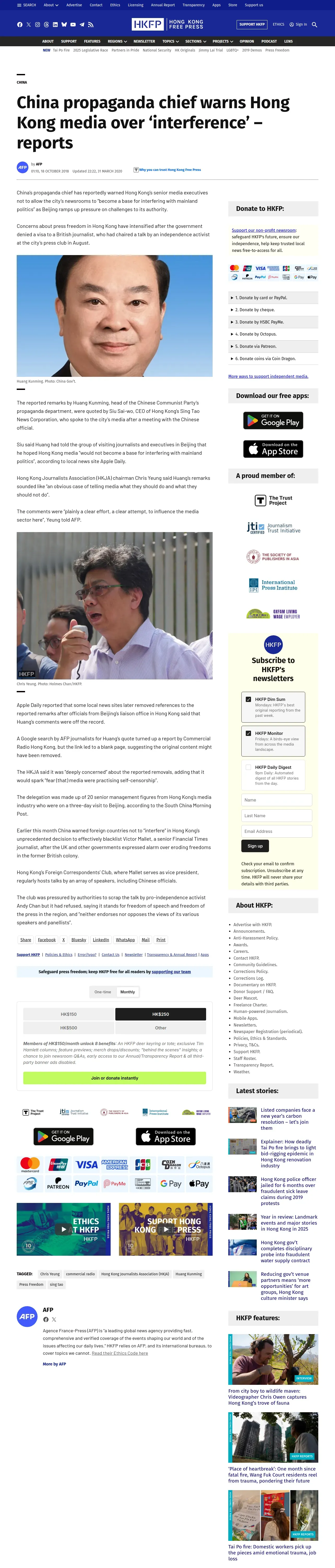 https://hongkongfp.com:443/2018/10/18/china-propaganda-chief-warns-hong-kong-media-interference-reports/