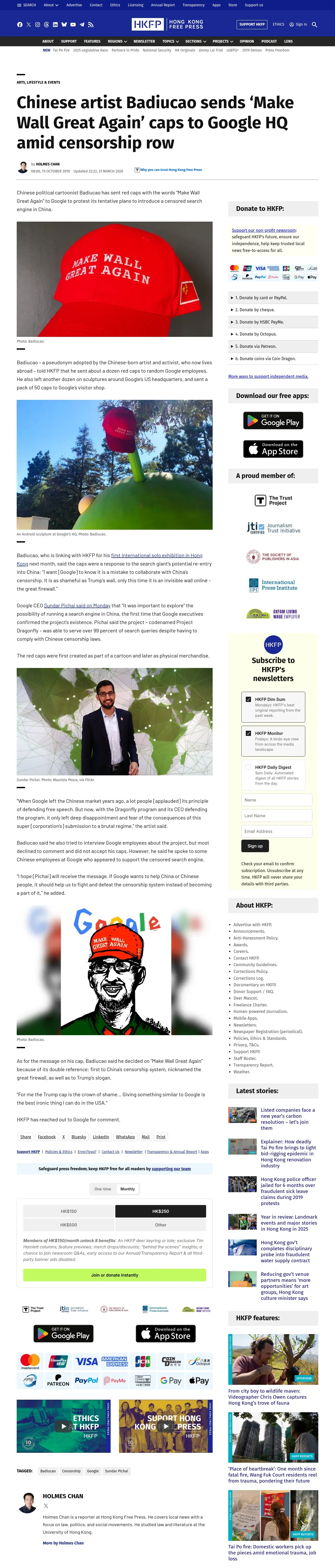 取得元URL: https://hongkongfp.com:443/2018/10/19/chinese-artist-badiucao-sends-make-wall-great-caps-google-hq-amid-censorship-row/