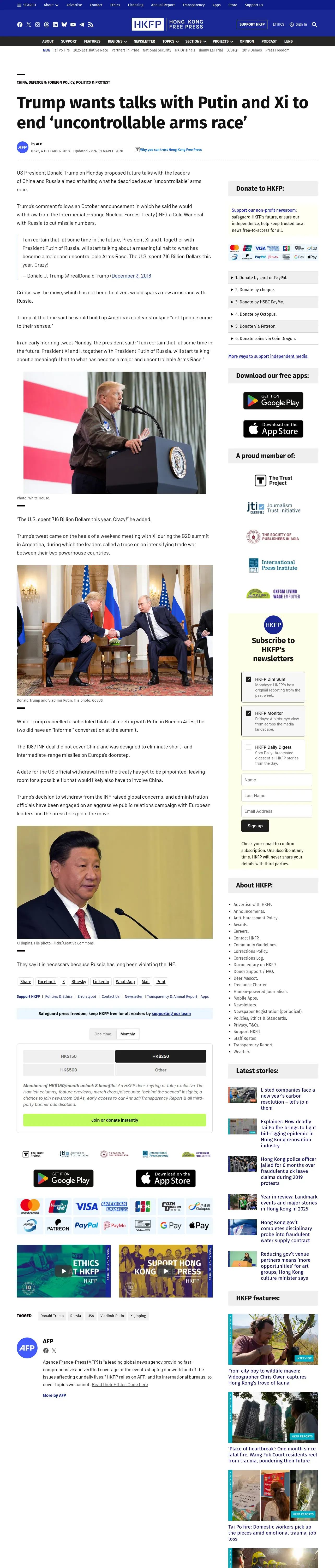 https://hongkongfp.com:443/2018/12/04/trump-wants-talks-putin-xi-end-uncontrollable-arms-race/