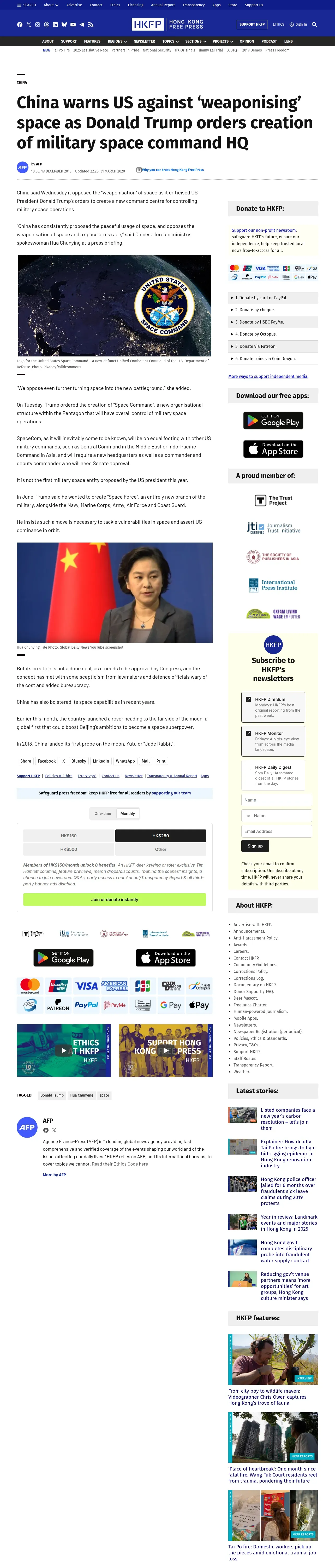 https://hongkongfp.com:443/2018/12/19/china-warns-us-weaponising-space-donald-trump-orders-creation-military-space-command-hq/