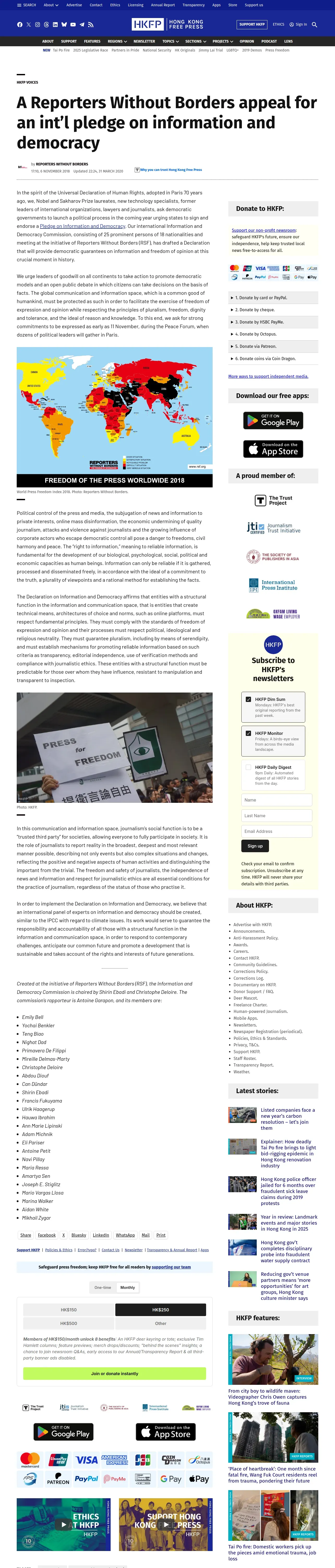 https://hongkongfp.com:443/2018/11/06/reporters-without-borders-appeal-intl-pledge-information-democracy/