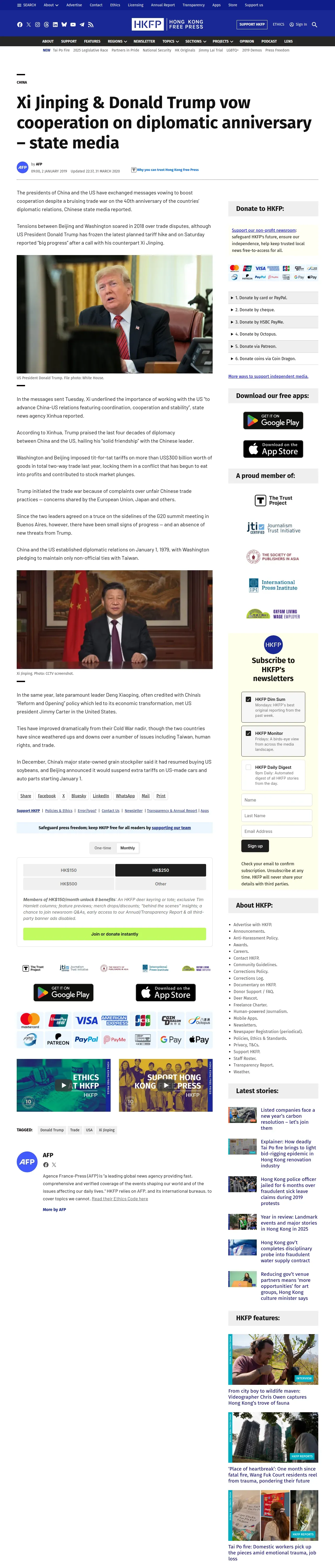 https://hongkongfp.com:443/2019/01/02/xi-jinping-donald-trump-vow-cooperation-diplomatic-anniversary-state-media/