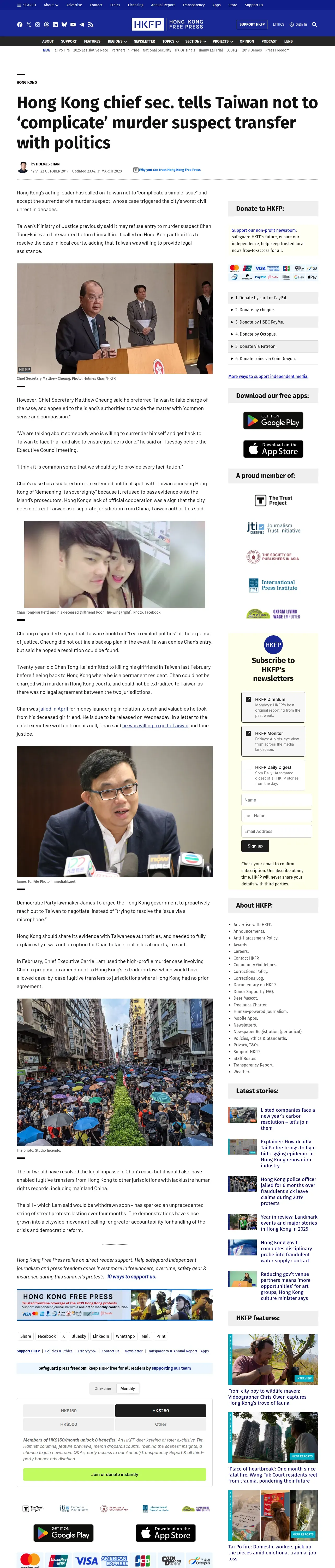 https://hongkongfp.com:443/2019/10/22/hong-kong-chief-sec-tells-taiwan-not-complicate-murder-suspect-transfer-politics/