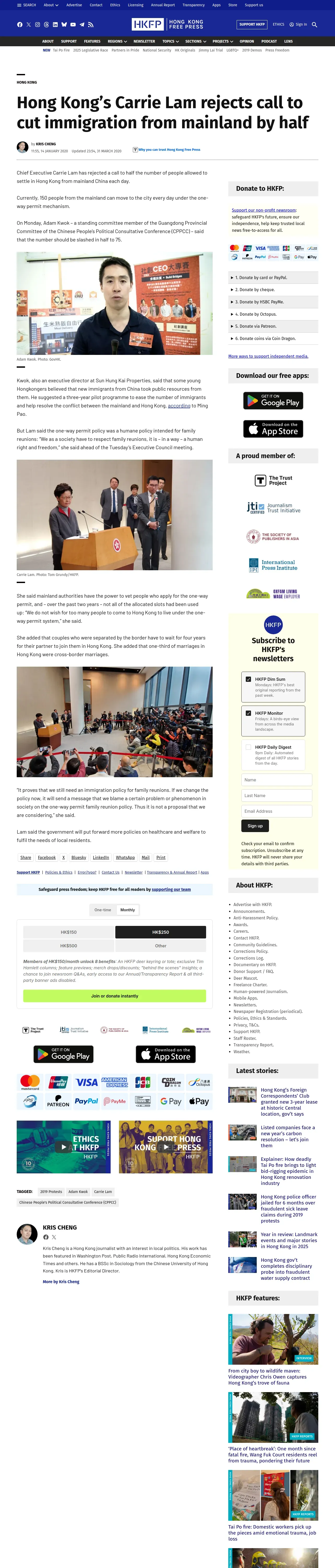 取得元URL: https://hongkongfp.com:443/2020/01/14/hong-kongs-carrie-lam-rejects-call-cut-immigration-mainland-half/