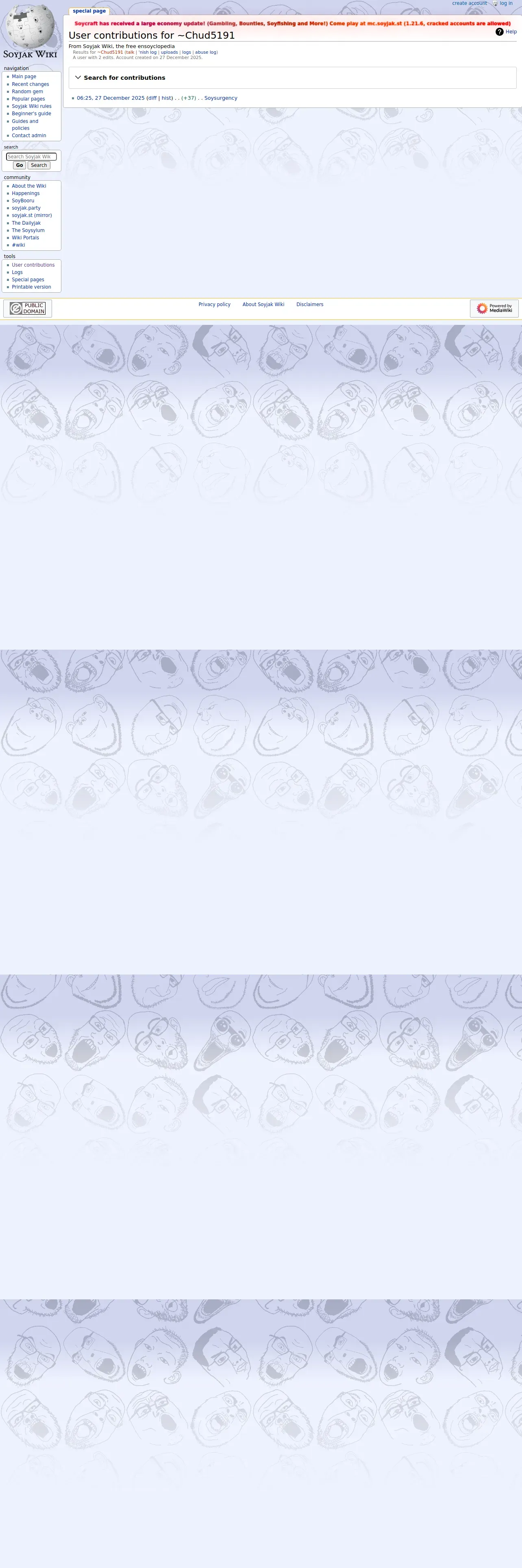 https://soyjakwiki.org:443/Special:Contributions/~Chud5191