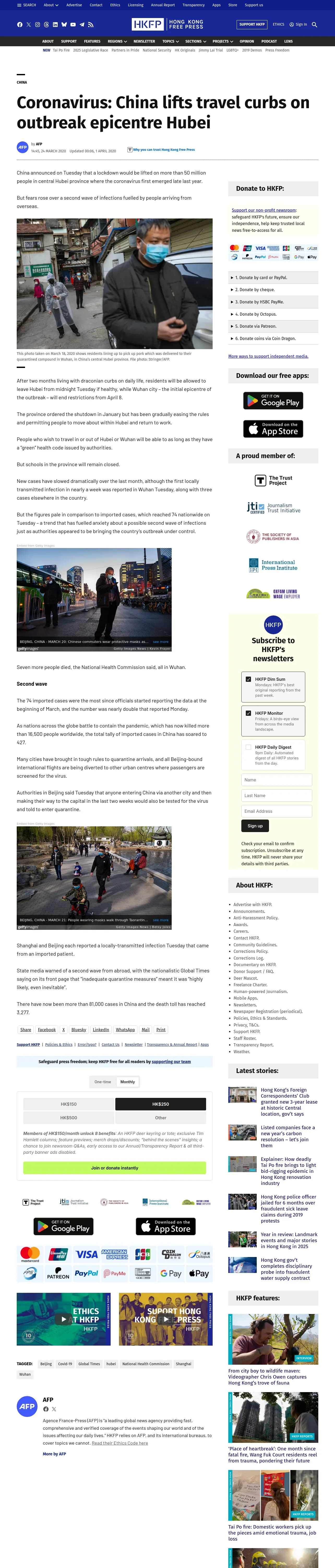 https://hongkongfp.com:443/2020/03/24/coronavirus-china-lifts-travel-curbs-outbreak-epicentre-hubei/