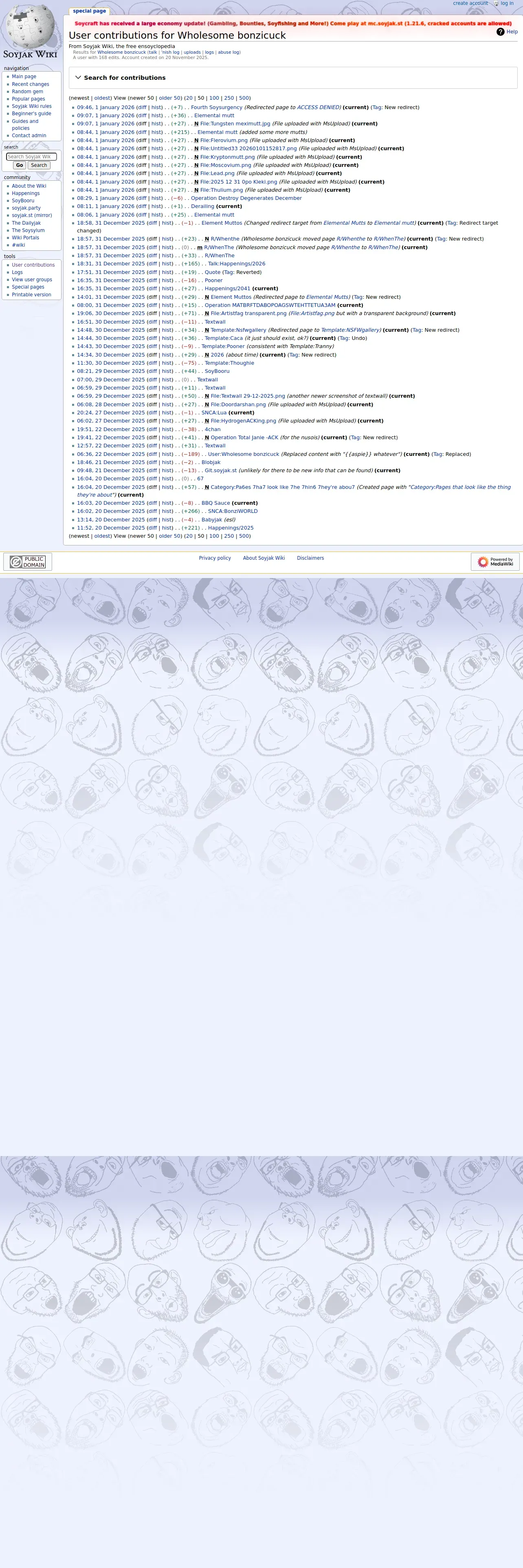 https://soyjakwiki.org:443/Special:Contributions/Wholesome_bonzicuck