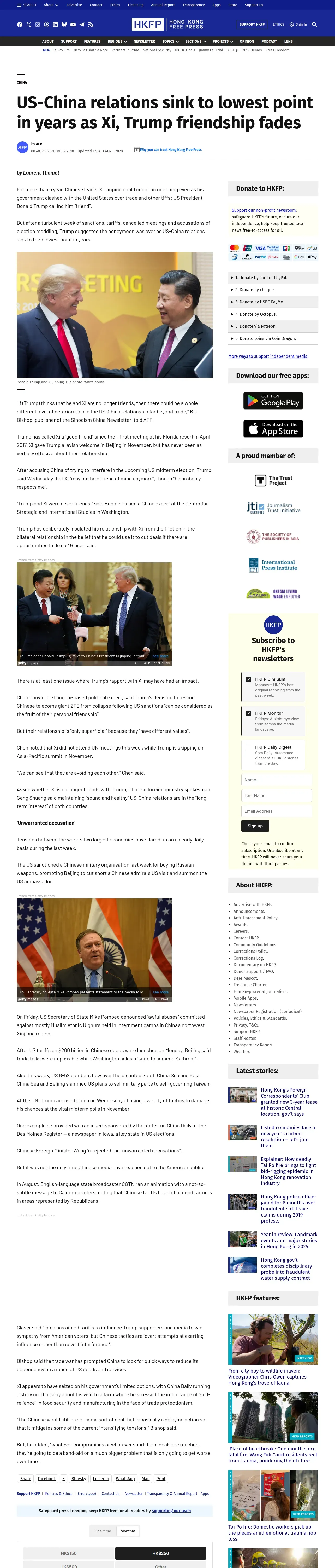 https://hongkongfp.com:443/2018/09/28/us-china-relations-sink-lowest-point-years-xi-trump-friendship-fades/