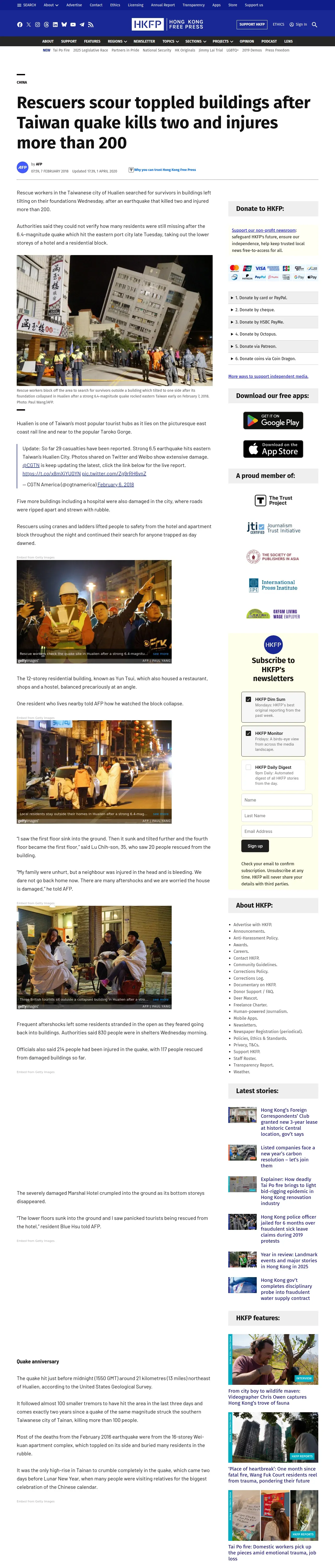 https://hongkongfp.com:443/2018/02/07/rescuers-scour-toppled-buildings-taiwan-quake-kills-two-injures-200/