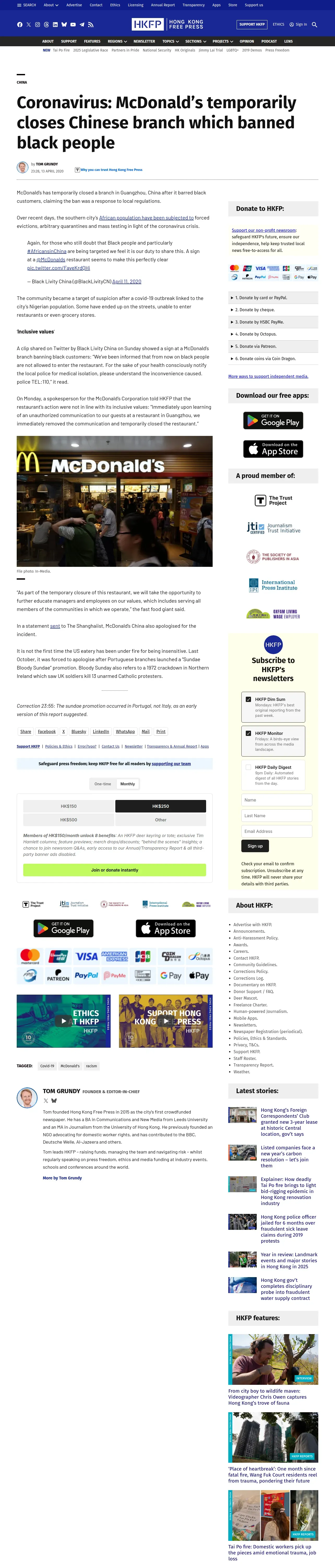 https://hongkongfp.com:443/2020/04/13/coronavirus-mcdonalds-temporarily-closes-chinese-branch-which-banned-black-people/