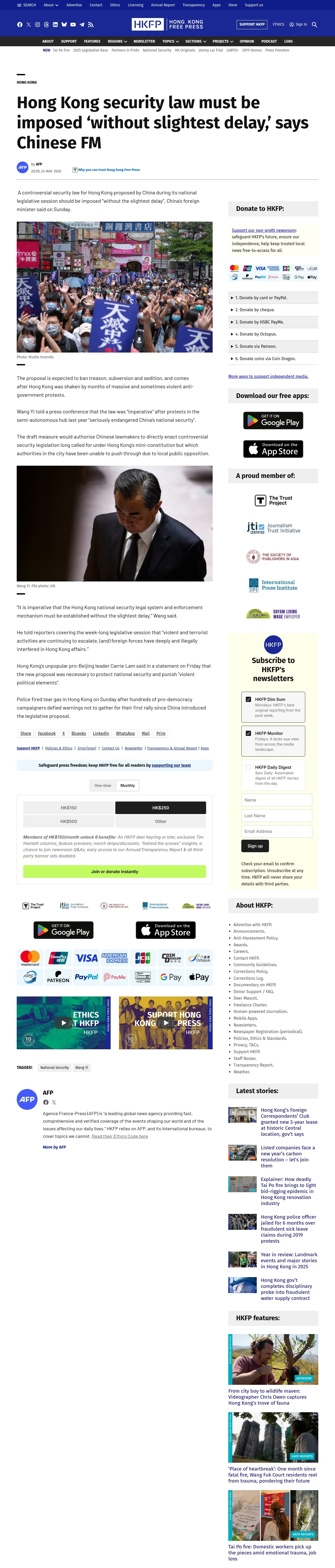 https://hongkongfp.com:443/2020/05/24/hong-kong-security-law-must-be-imposed-without-slightest-delay-says-chinese-fm/