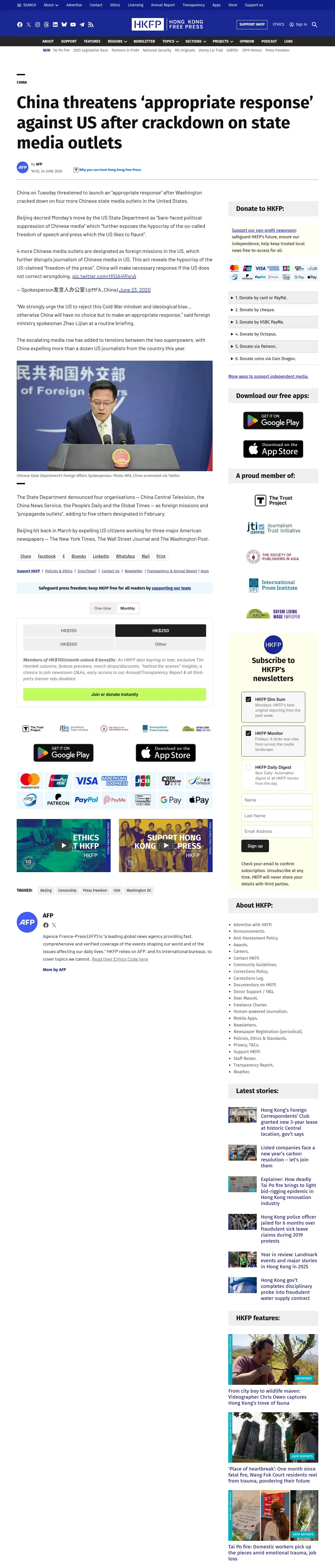 https://hongkongfp.com:443/2020/06/24/china-threatens-appropriate-response-against-us-after-crackdown-on-state-media-outlets/
