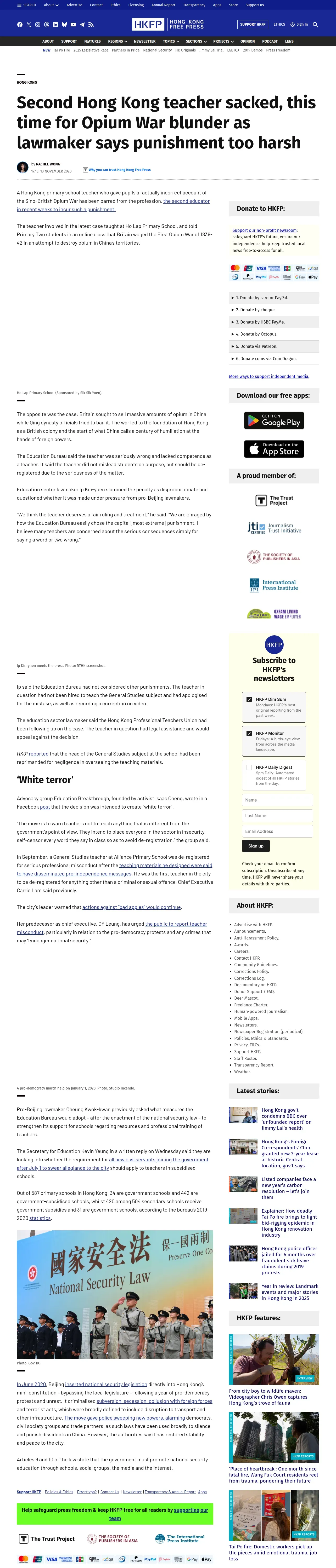 https://hongkongfp.com:443/2020/11/13/second-hong-kong-teacher-sacked-this-time-for-opium-war-blunder-as-lawmaker-says-punishment-too-harsh/