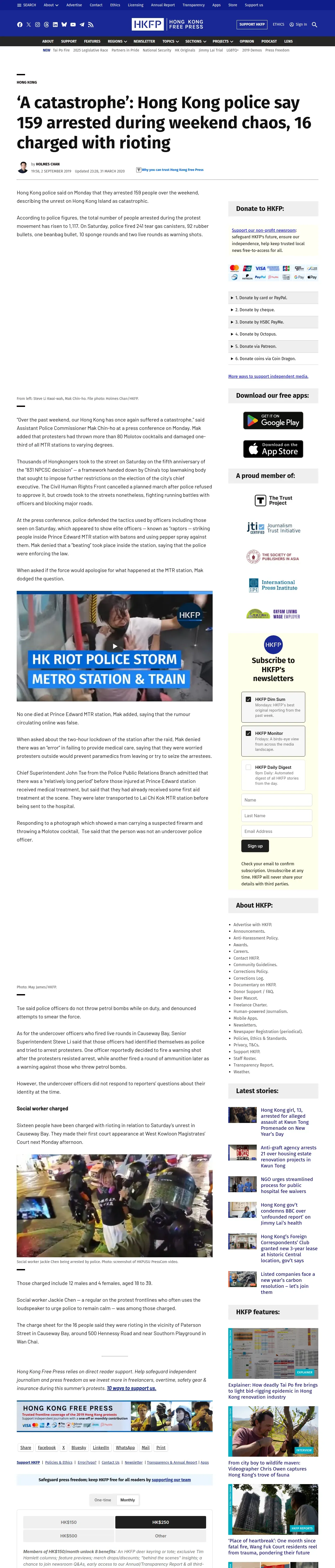 https://hongkongfp.com:443/2019/09/02/catastrophe-hong-kong-police-say-159-arrested-weekend-chaos-16-charged-rioting/