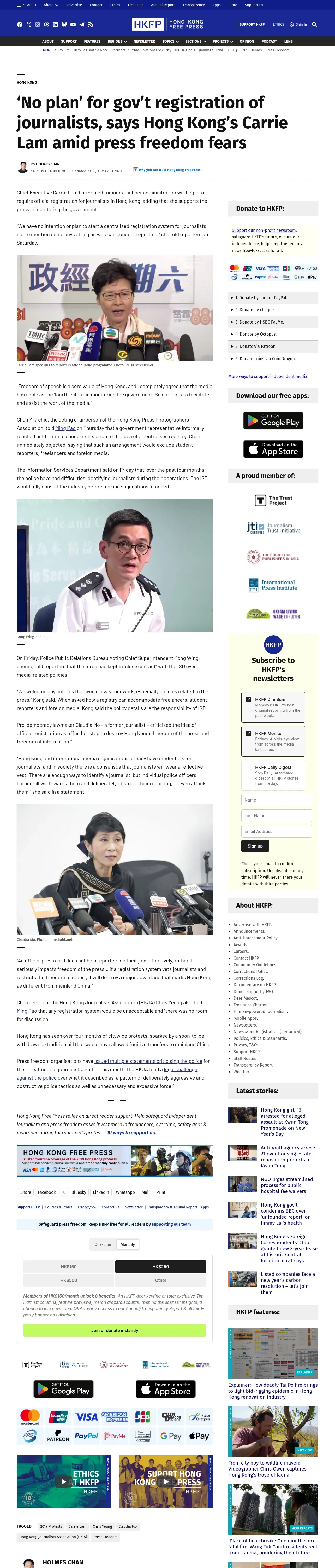 https://hongkongfp.com:443/2019/10/19/no-plan-govt-registration-journalists-says-hong-kongs-carrie-lam-amid-press-freedom-fears/