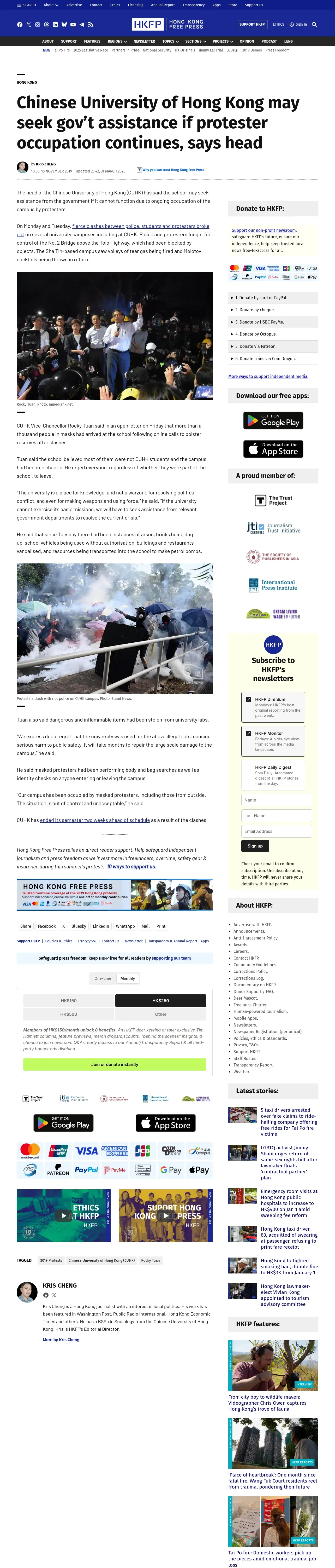 取得元URL: https://hongkongfp.com:443/2019/11/15/chinese-university-hong-kong-may-seek-govt-assistance-protester-occupation-continues-says-head/
