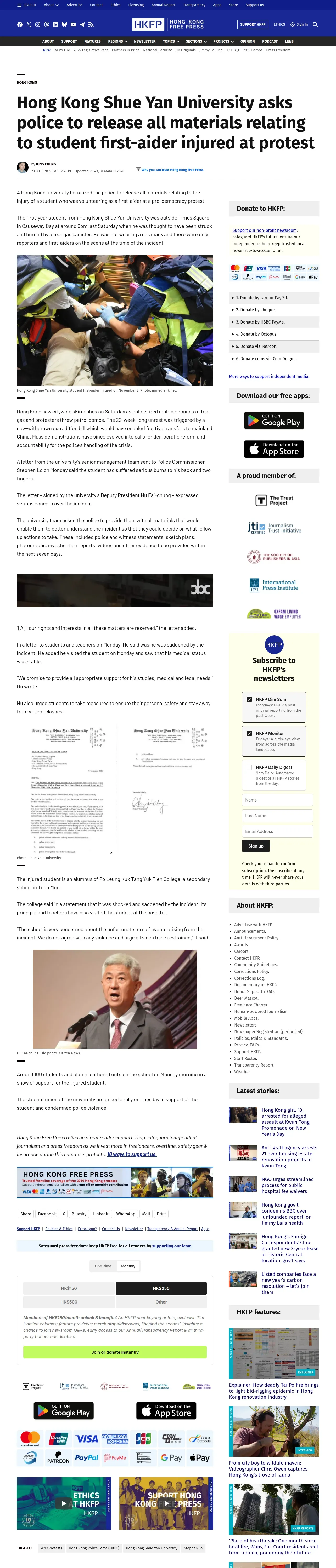 https://hongkongfp.com:443/2019/11/05/hong-kong-shue-yan-university-asks-police-release-materials-relating-student-first-aider-injured-protest/