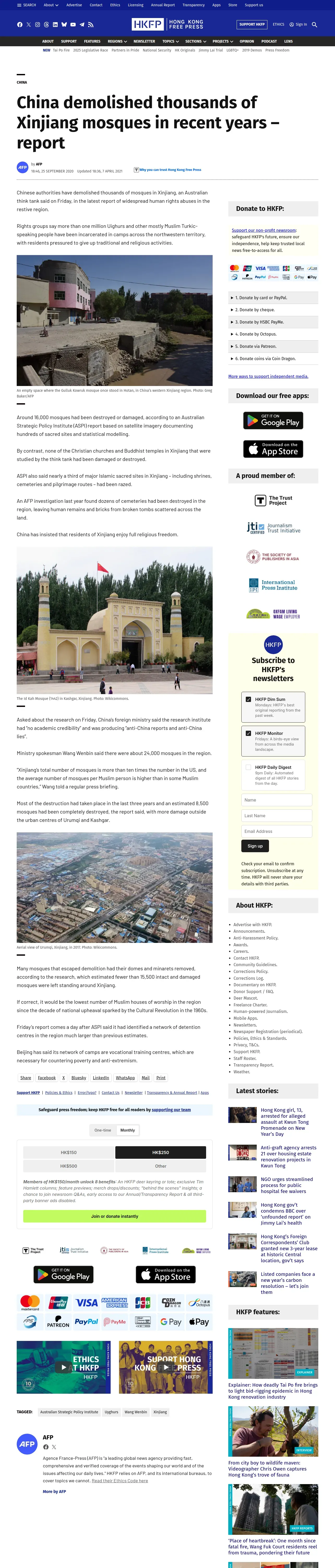 https://hongkongfp.com:443/2020/09/25/china-demolished-thousands-of-xinjiang-mosques-in-recent-years-report/