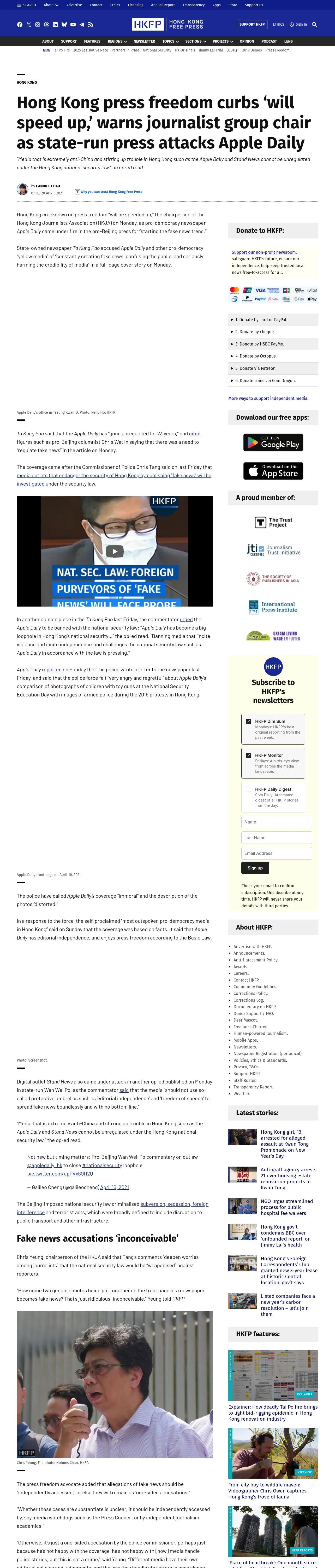 取得元URL: https://hongkongfp.com:443/2021/04/20/hong-kong-press-freedom-curbs-will-speed-up-warns-journalist-group-chair-as-state-run-press-attacks-apple-daily/