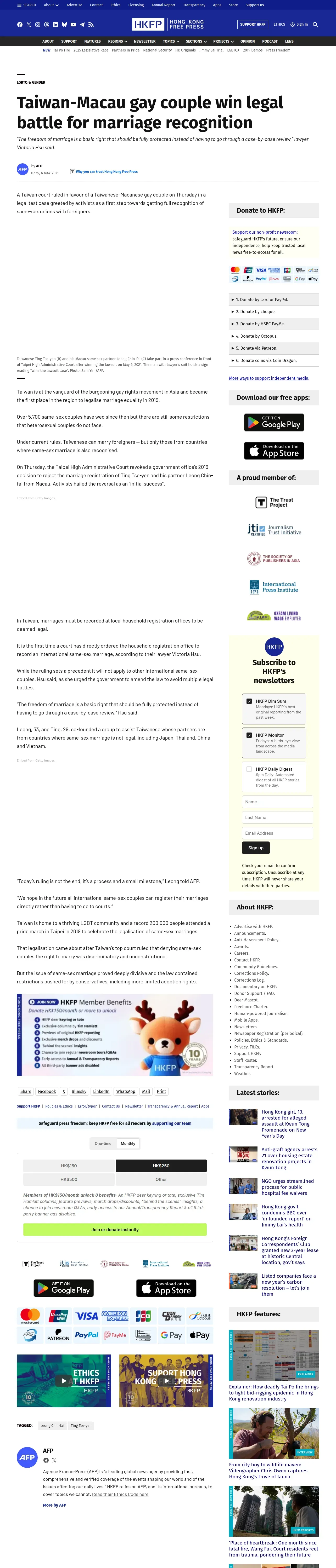 取得元URL: https://hongkongfp.com:443/2021/05/06/taiwan-macau-gay-couple-win-legal-battle-for-marriage-recognition/