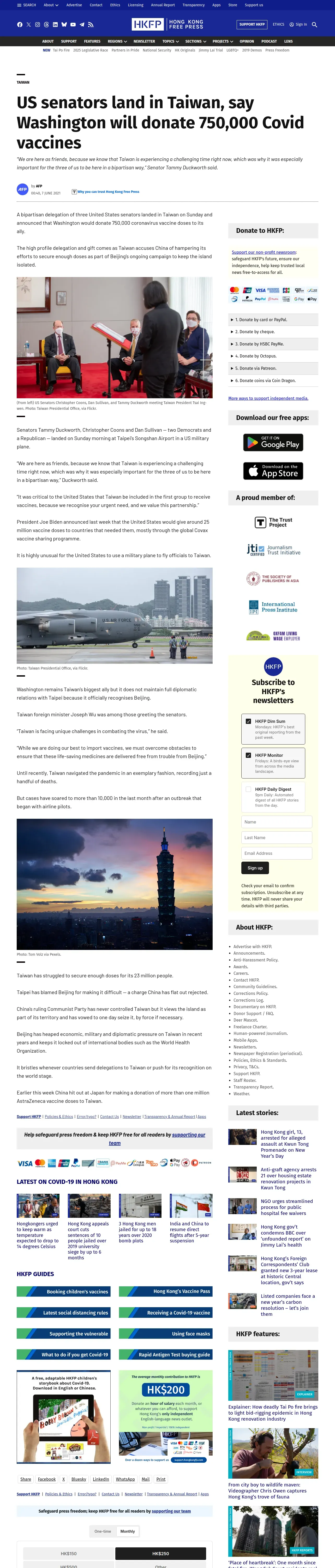 https://hongkongfp.com:443/2021/06/07/us-senators-land-in-taiwan-say-washington-will-donate-750000-covid-vaccines/
