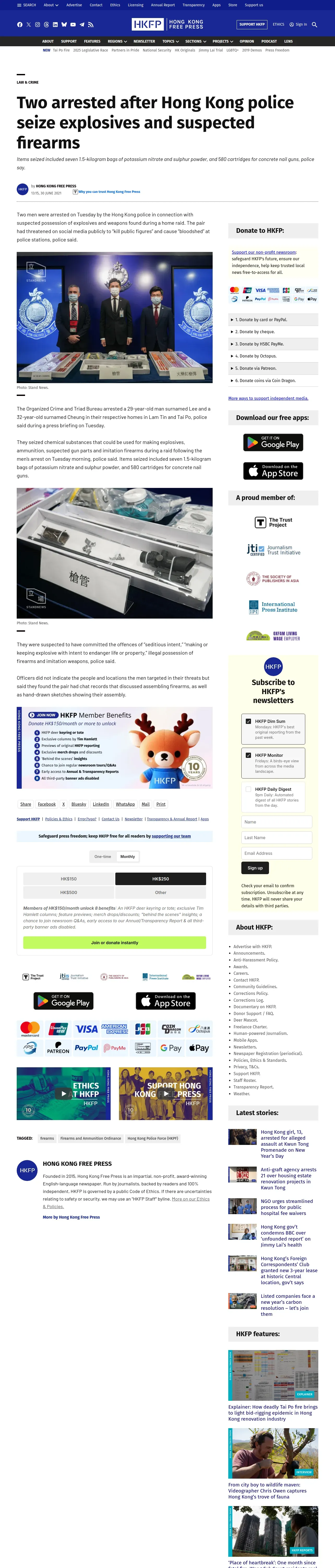https://hongkongfp.com:443/2021/06/30/two-arrested-after-hong-kong-police-seize-explosives-and-suspected-firearms/