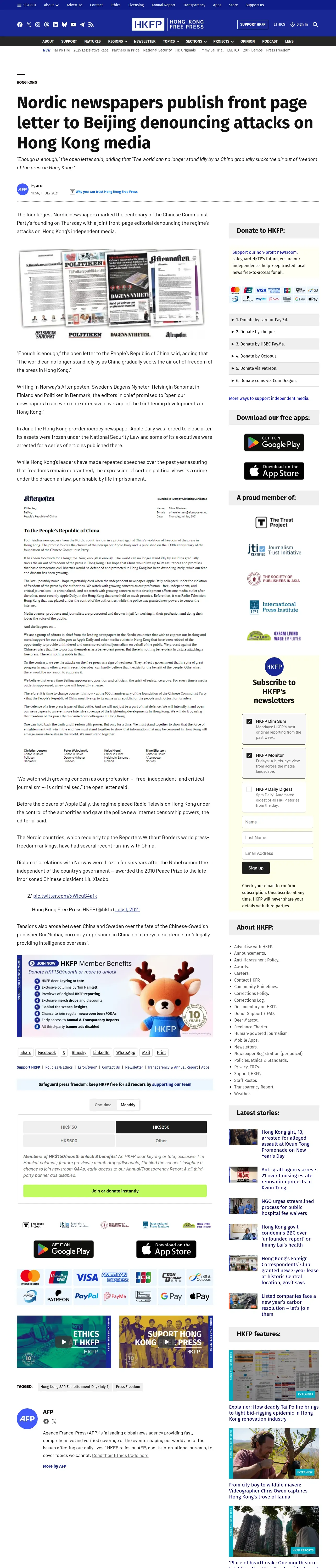 https://hongkongfp.com:443/2021/07/01/nordic-newspapers-publish-front-page-letter-to-beijing-denouncing-attacks-on-hong-kong-media/