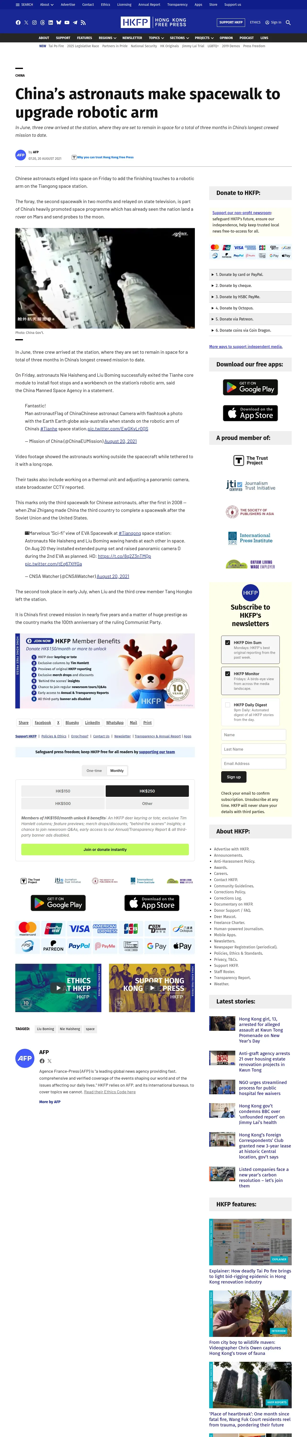 https://hongkongfp.com:443/2021/08/20/chinas-astronauts-make-spacewalk-to-upgrade-robotic-arm/