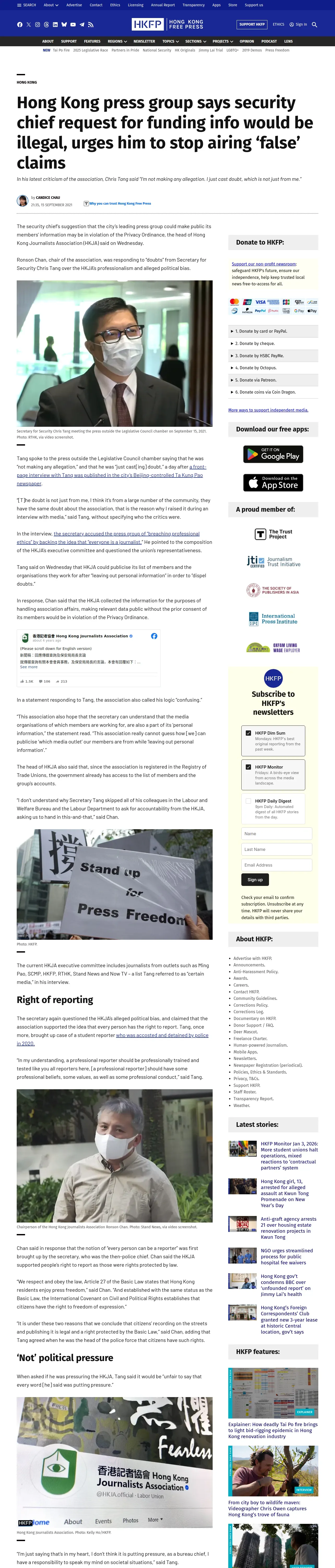 取得元URL: https://hongkongfp.com:443/2021/09/15/hong-kong-press-group-says-security-chief-request-for-funding-info-would-be-illegal-urges-him-to-stop-airing-false-claims/