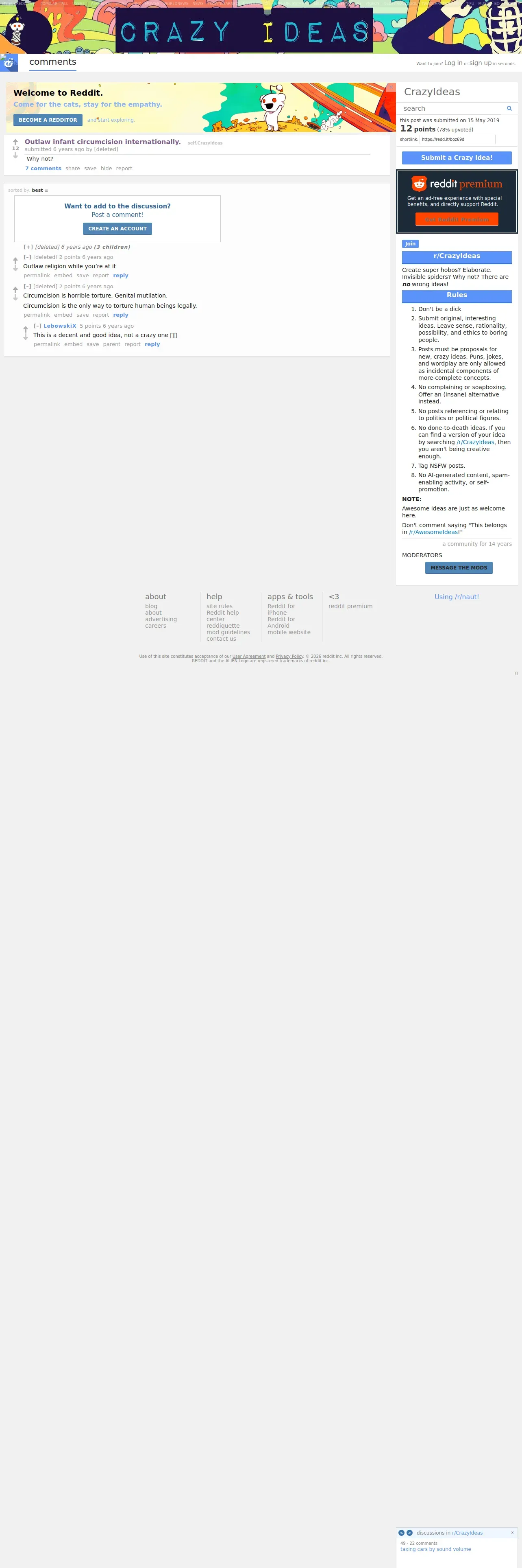 https://old.reddit.com:443/r/CrazyIdeas/comments/boz69d/outlaw_infant_circumcision_internationally/