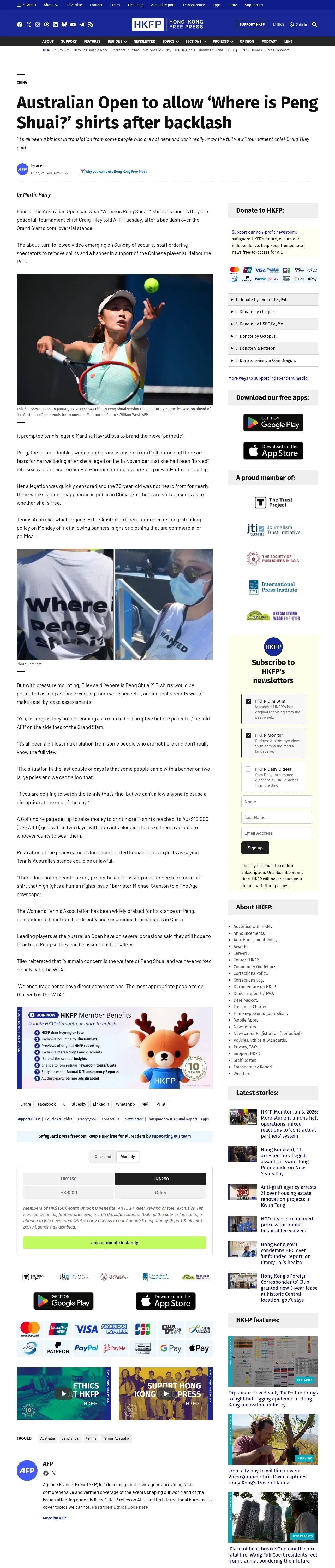 https://hongkongfp.com:443/2022/01/25/australian-open-to-allow-where-is-peng-shuai-shirts-after-backlash/