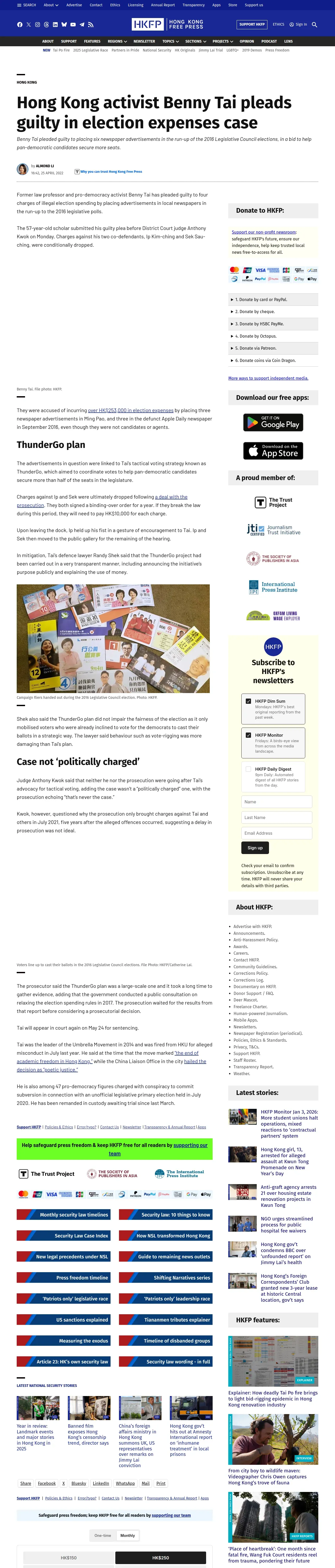 https://hongkongfp.com:443/2022/04/25/hong-kong-activist-benny-tai-pleads-guilty-in-election-expenses-case/