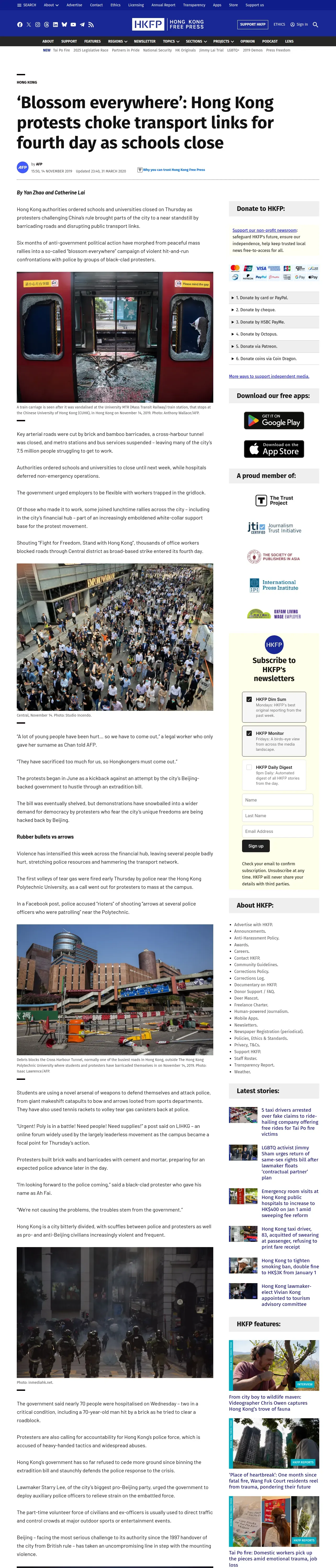 https://hongkongfp.com:443/2019/11/14/blossom-everywhere-hong-kong-protests-choke-transport-links-fourth-day-schools-close/