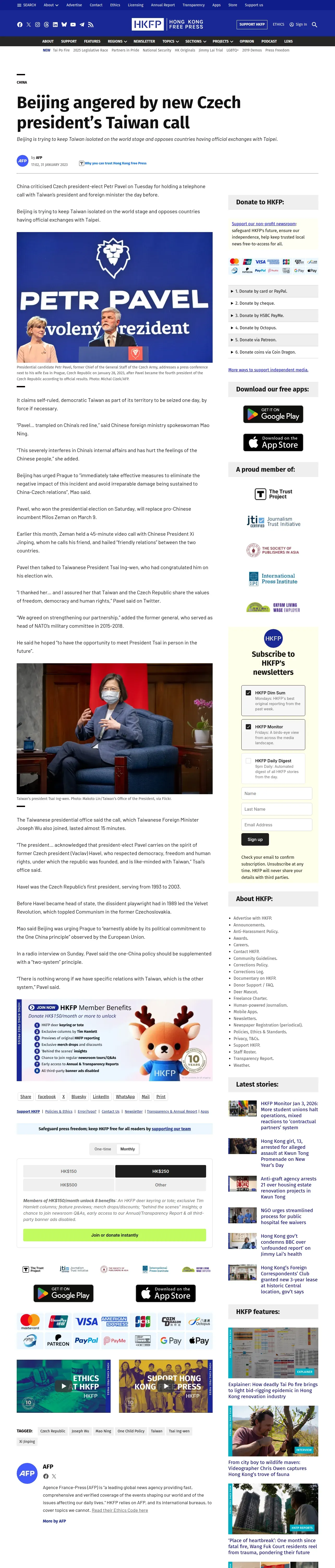 取得元URL: https://hongkongfp.com:443/2023/01/31/beijing-angered-by-new-czech-presidents-taiwan-call/