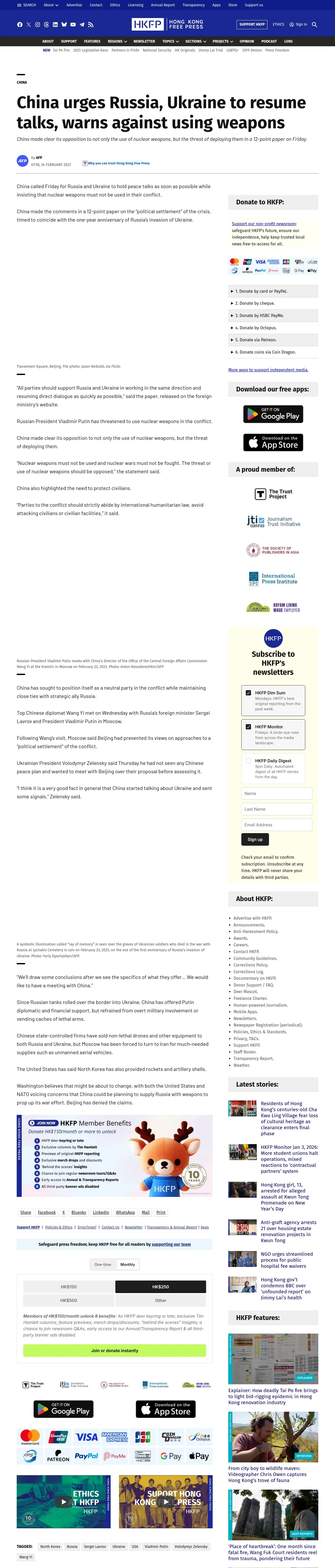 https://hongkongfp.com:443/2023/02/24/china-urges-russia-ukraine-to-resume-talks-warns-against-using-weapons/