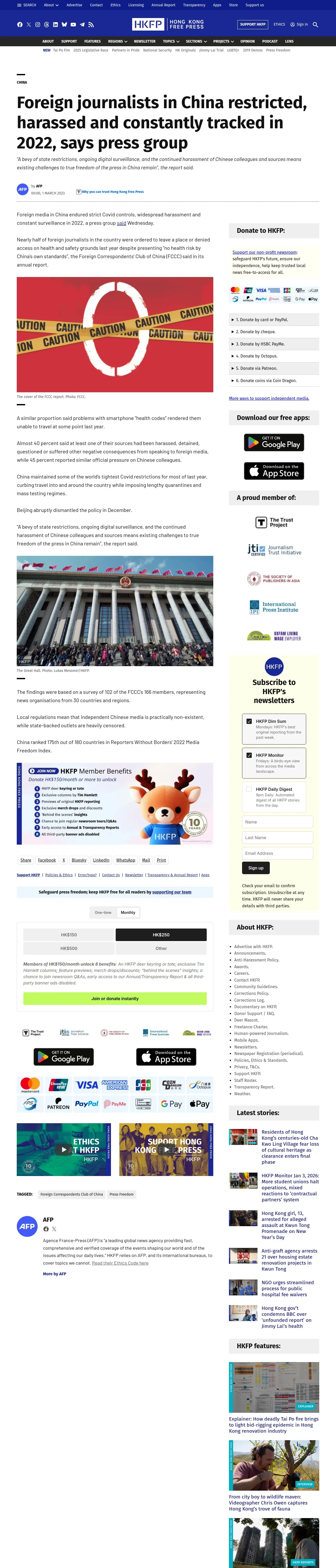 https://hongkongfp.com:443/2023/03/01/foreign-journalists-in-china-restricted-harassed-and-constantly-tracked-in-2022-says-press-group/