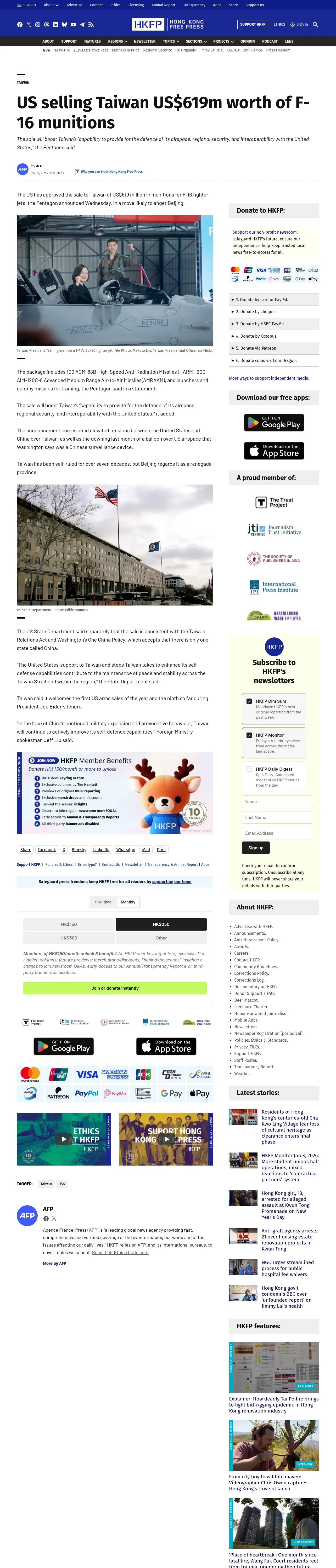 https://hongkongfp.com:443/2023/03/02/us-selling-taiwan-us619m-worth-of-f-16-munitions/