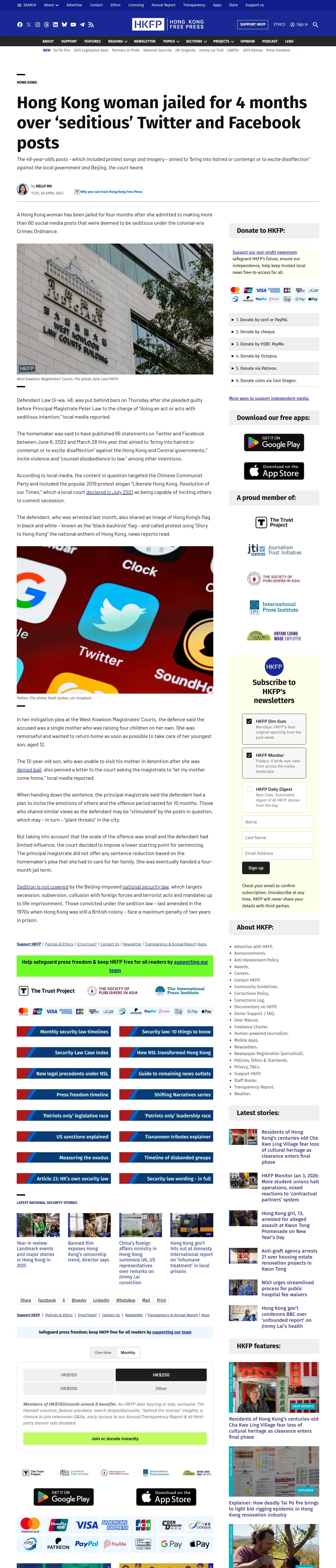 https://hongkongfp.com:443/2023/04/28/hong-kong-woman-jailed-for-4-months-over-seditious-twitter-and-facebook-posts/