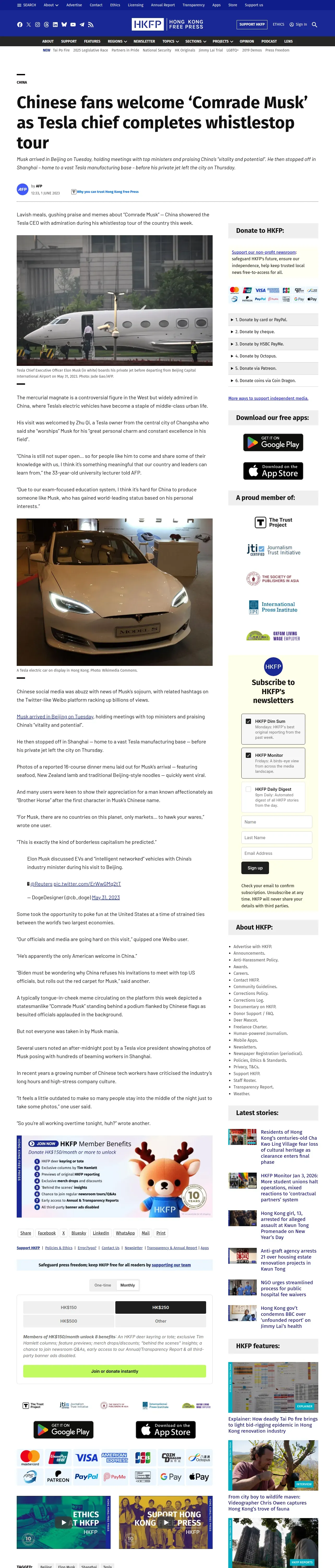 https://hongkongfp.com:443/2023/06/01/chinese-fans-welcome-comrade-musk-as-tesla-chief-completes-whistlestop-tour/