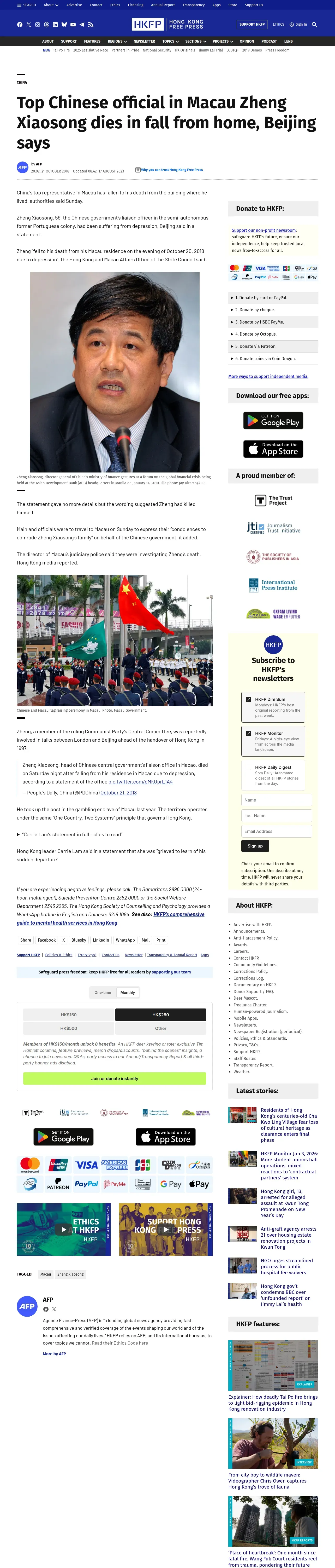 https://hongkongfp.com:443/2018/10/21/top-chinese-official-macau-zheng-xiaosong-dies-fall-home-beijing-says/