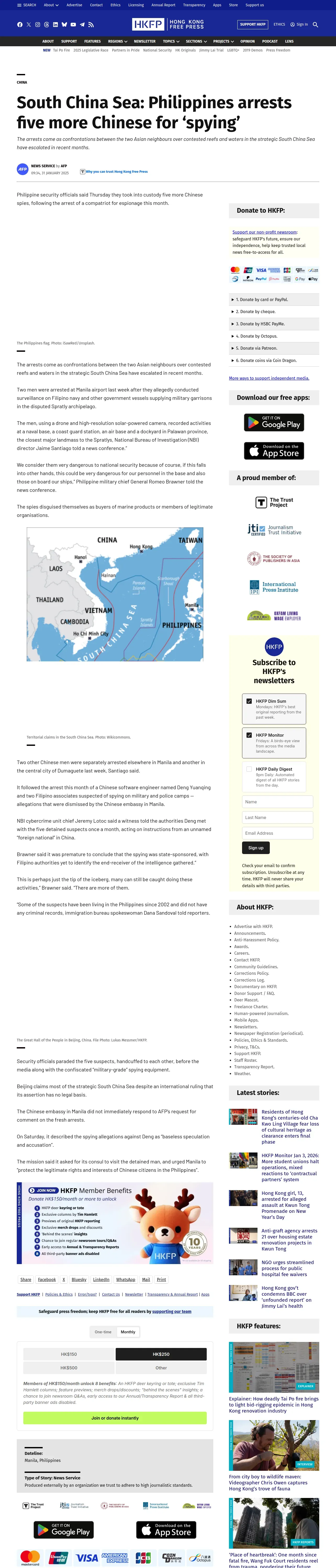 https://hongkongfp.com:443/2025/01/31/south-china-sea-philippines-arrests-five-more-chinese-for-spying/