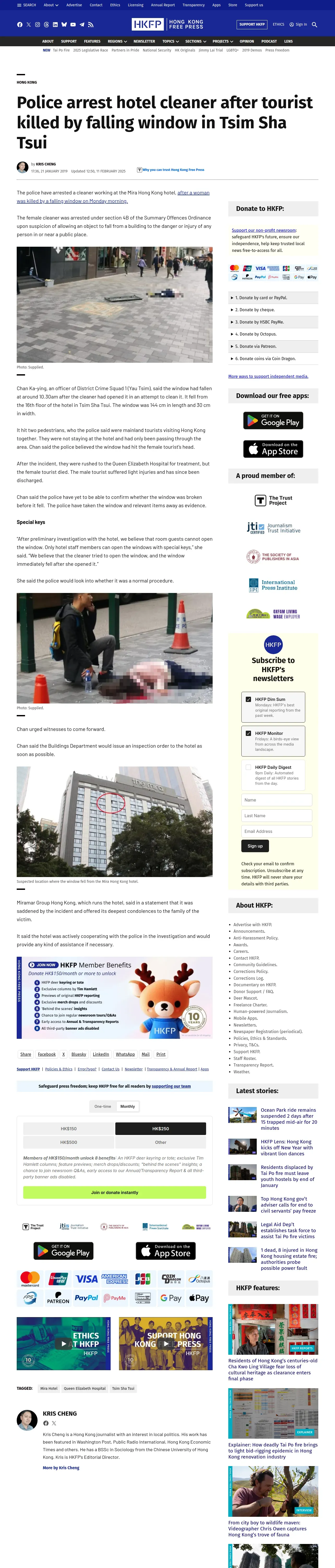https://hongkongfp.com:443/2019/01/21/police-arrest-hotel-cleaner-tourist-killed-falling-window-tsim-sha-tsui/