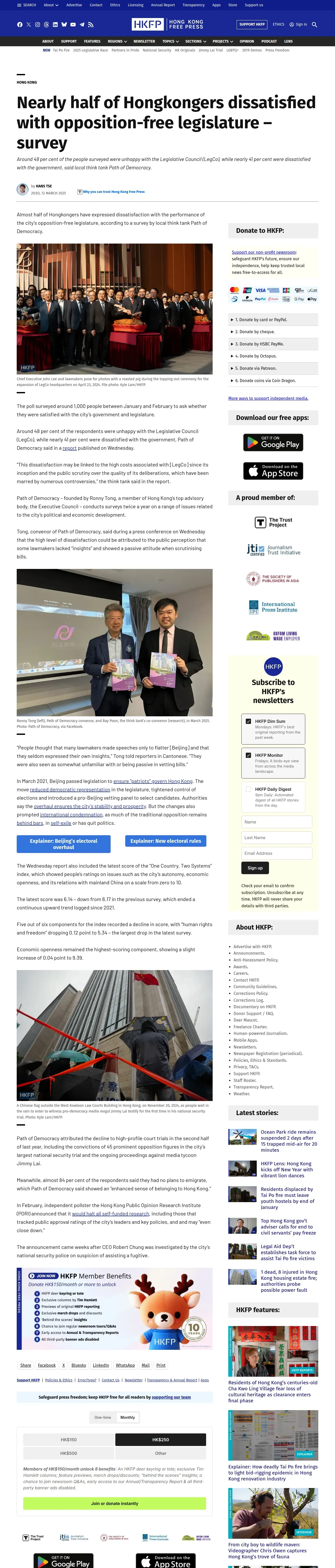 https://hongkongfp.com:443/2025/03/12/nearly-half-of-hongkongers-dissatisfied-with-opposition-free-legislature-survey/