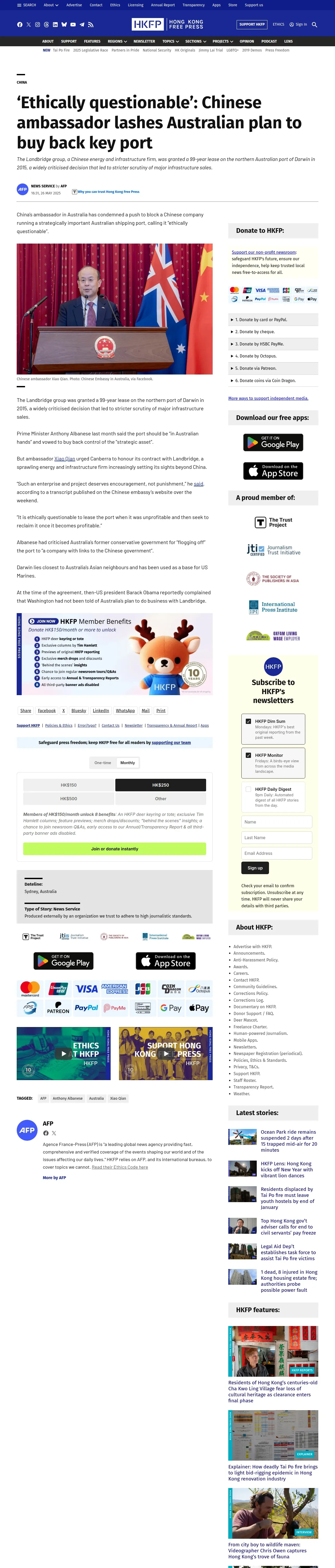 https://hongkongfp.com:443/2025/05/26/ethically-questionable-chinese-ambassador-lashes-australian-plan-to-buy-back-key-port/