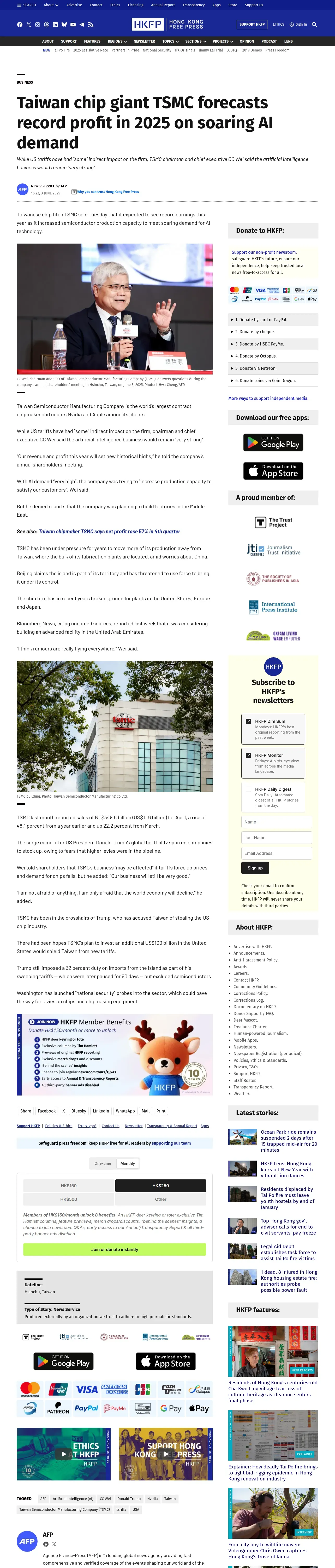https://hongkongfp.com:443/2025/06/03/taiwan-chip-giant-tsmc-forecasts-record-profit-in-2025-on-soaring-ai-demand/