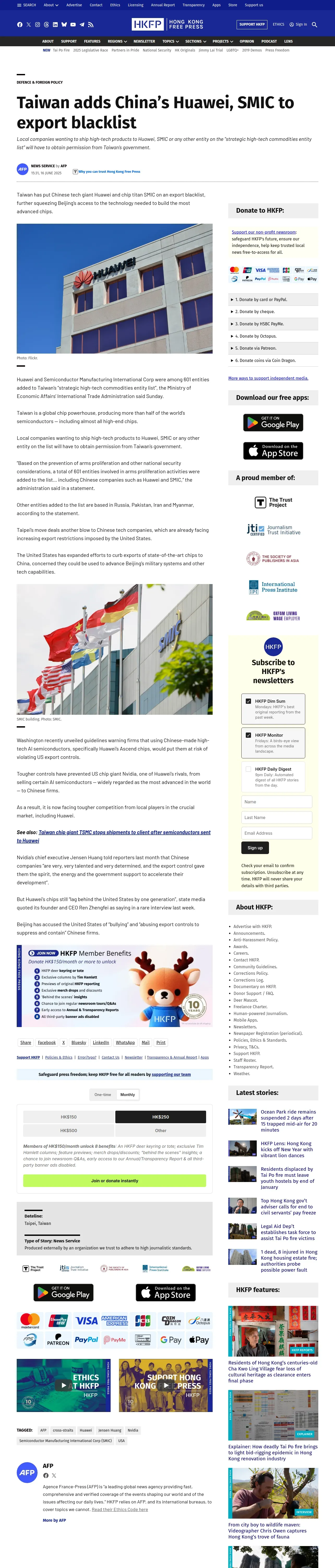 https://hongkongfp.com:443/2025/06/16/taiwan-adds-chinas-huawei-smic-to-export-blacklist/