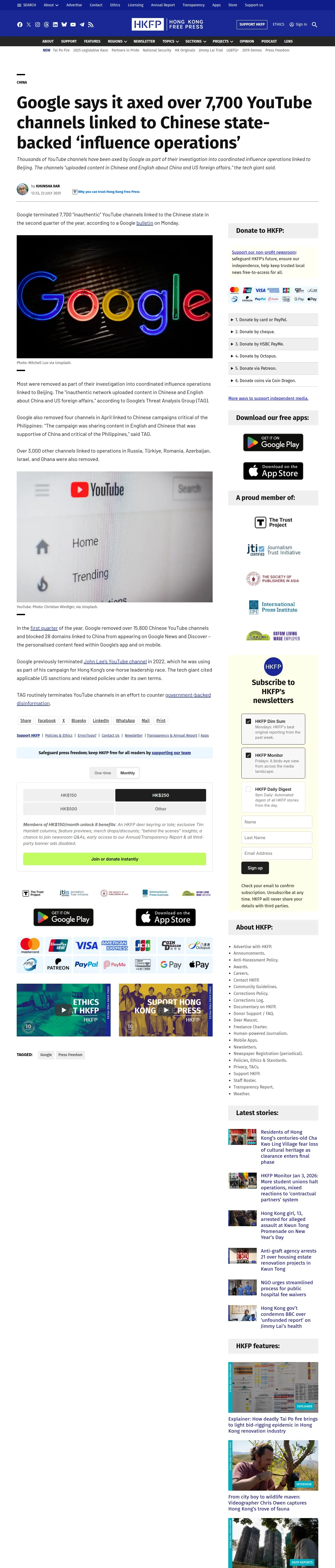 https://hongkongfp.com:443/2025/07/23/googles-terminates-over-7700-youtube-channels-it-linked-to-chinese-state-backed-influence-operations/