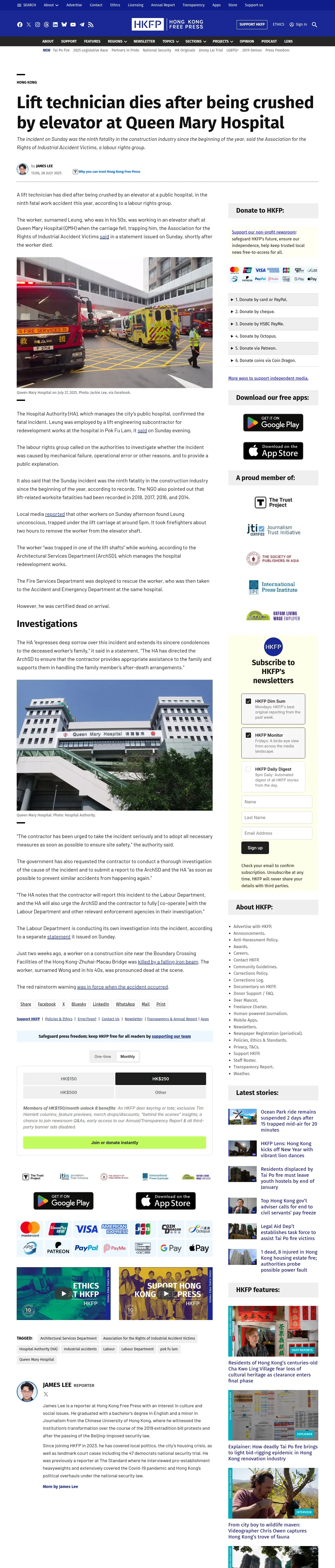 https://hongkongfp.com:443/2025/07/28/lift-technician-dies-after-being-crushed-by-elevator-at-queen-mary-hospital/