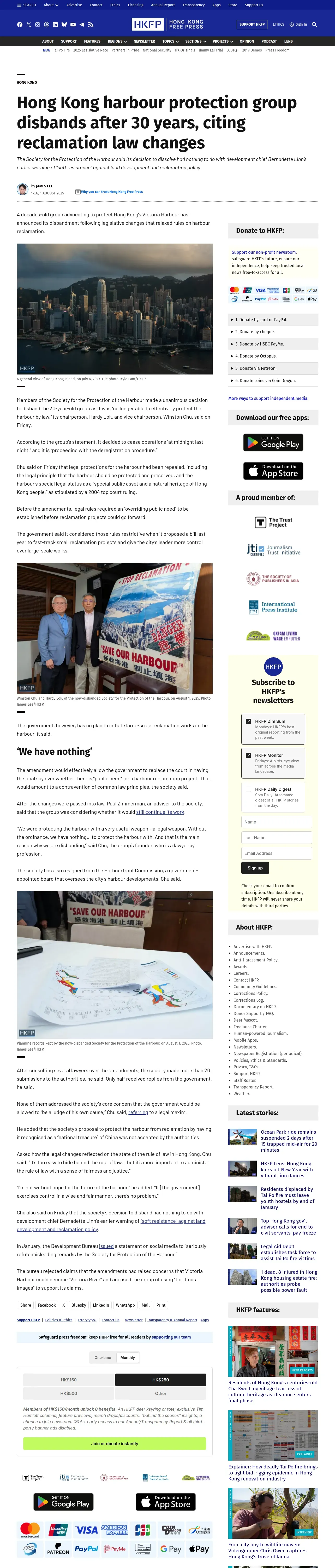 https://hongkongfp.com:443/2025/08/01/hong-kong-harbour-protection-group-disbands-after-30-years-citing-reclamation-law-changes/