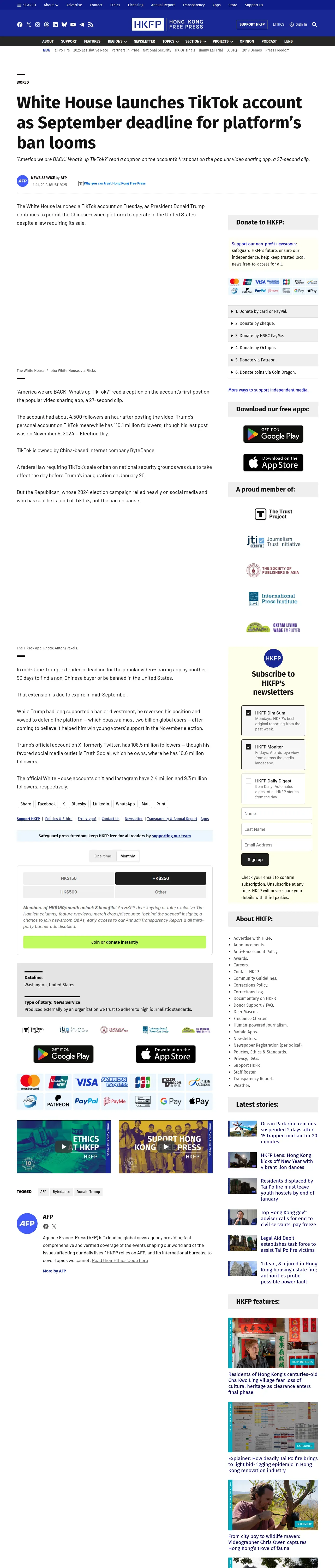 https://hongkongfp.com:443/2025/08/20/white-house-launches-tiktok-account-as-september-deadline-for-platforms-ban-looms/